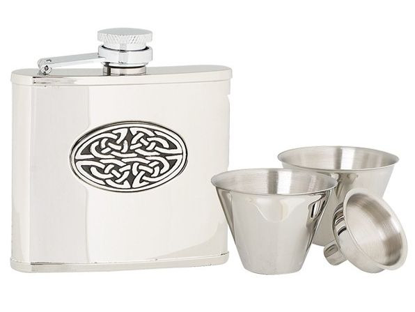 Prachtige cadeauset met een 4oz hipflask met daarop een ovale keltisch knoop. Deze hipflask heeft een glanzende finish.