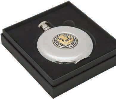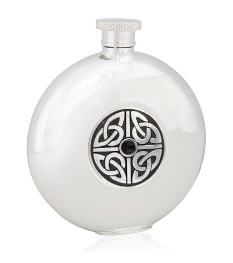 Mooie ronde hipflask met daarop een keltische knoop met zwarte steen.