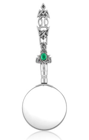 Dit vergrootglas heeft een zeer mooi handvat in de vorm van een keltische knoop met daarin een glimmende groene steen.