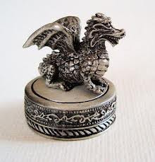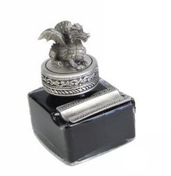 De mooie bewerkte dop met draak is gemaakt van pewter.