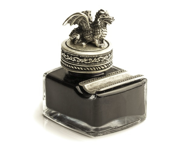 Deze glazen inktpot is gevuld met zwarte inkt en heeft een handige, pewter oplegger om de (kroontjes)pen op te laten rusten.