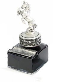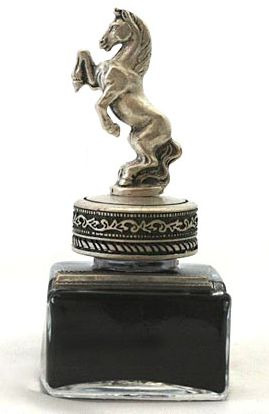 Prachtige, rechthoekige inktpot met daarop een steigerend paard.