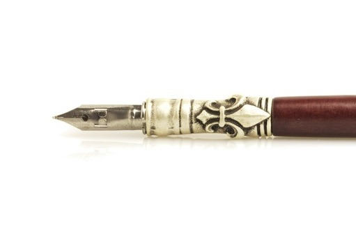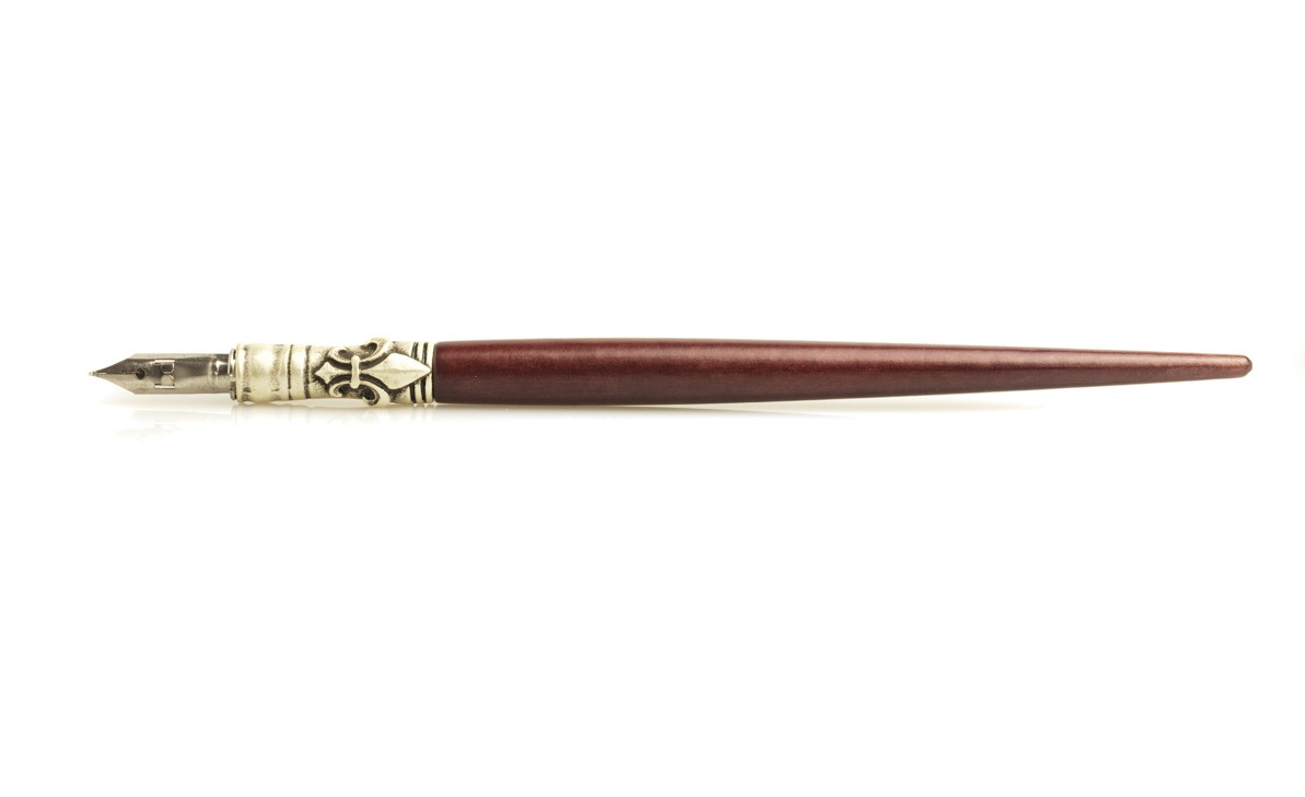 This is a beautiful calligraphic pen in birch wood with a mahogany finish. It has a metal end, which is decorated with a lily and it comes with a nib with tank.