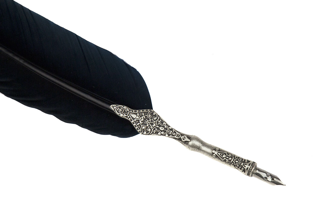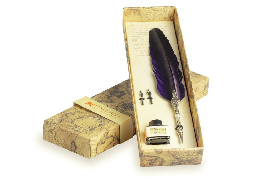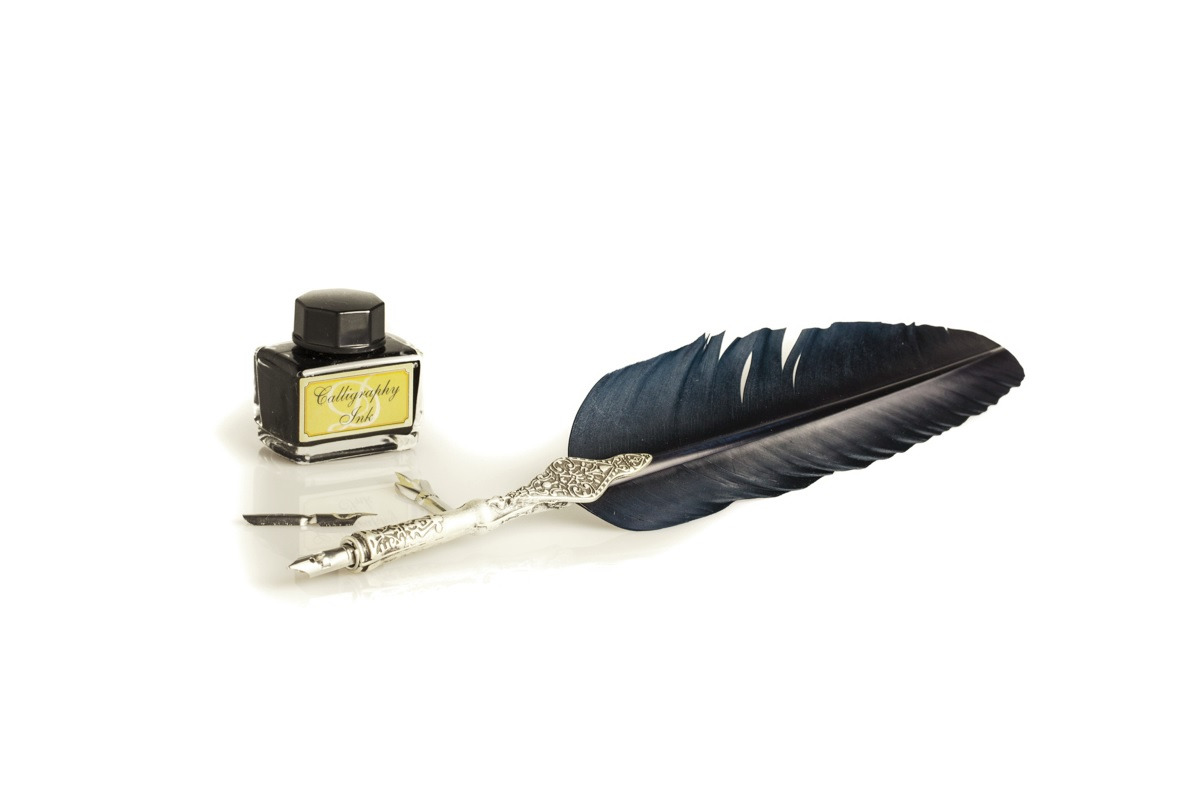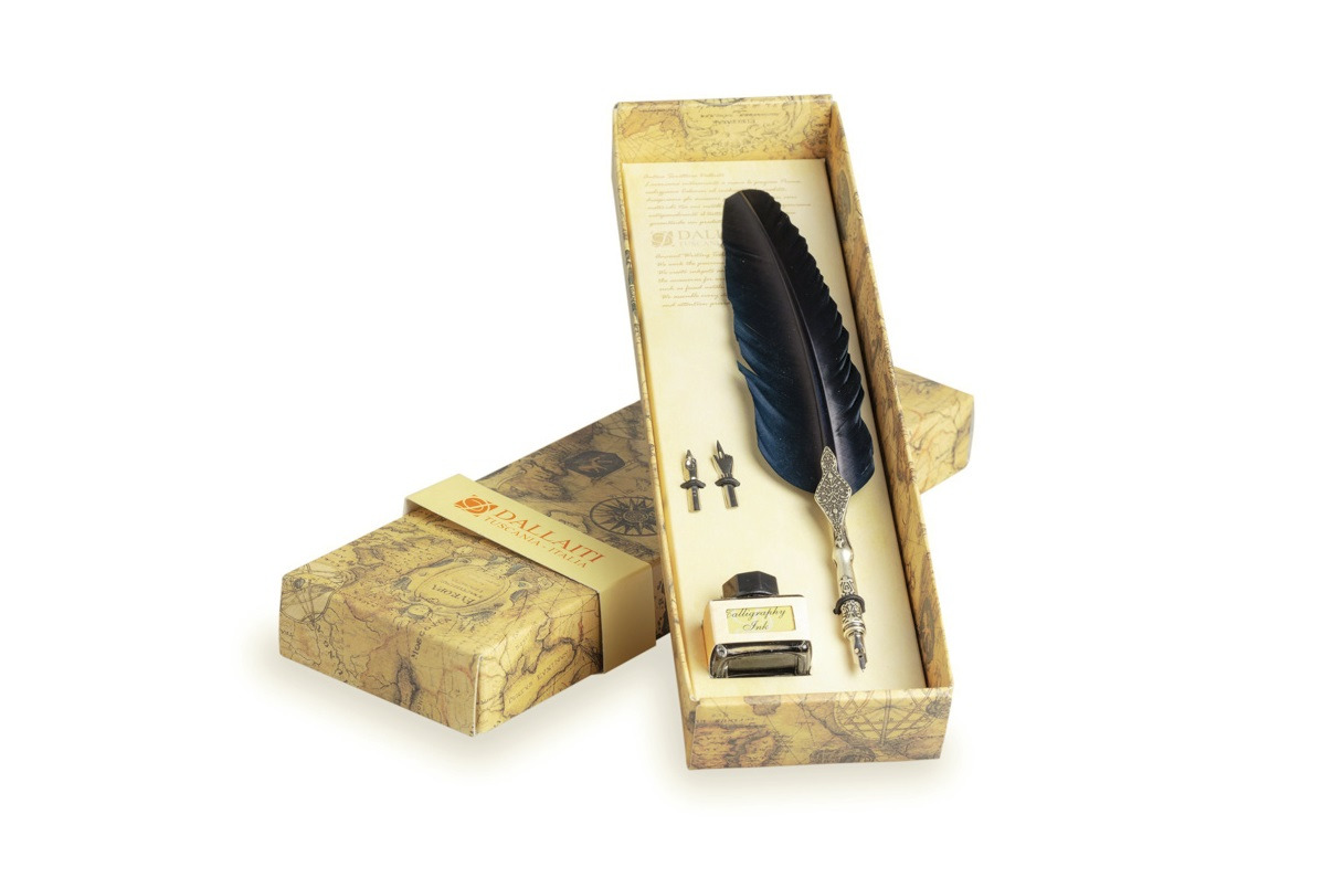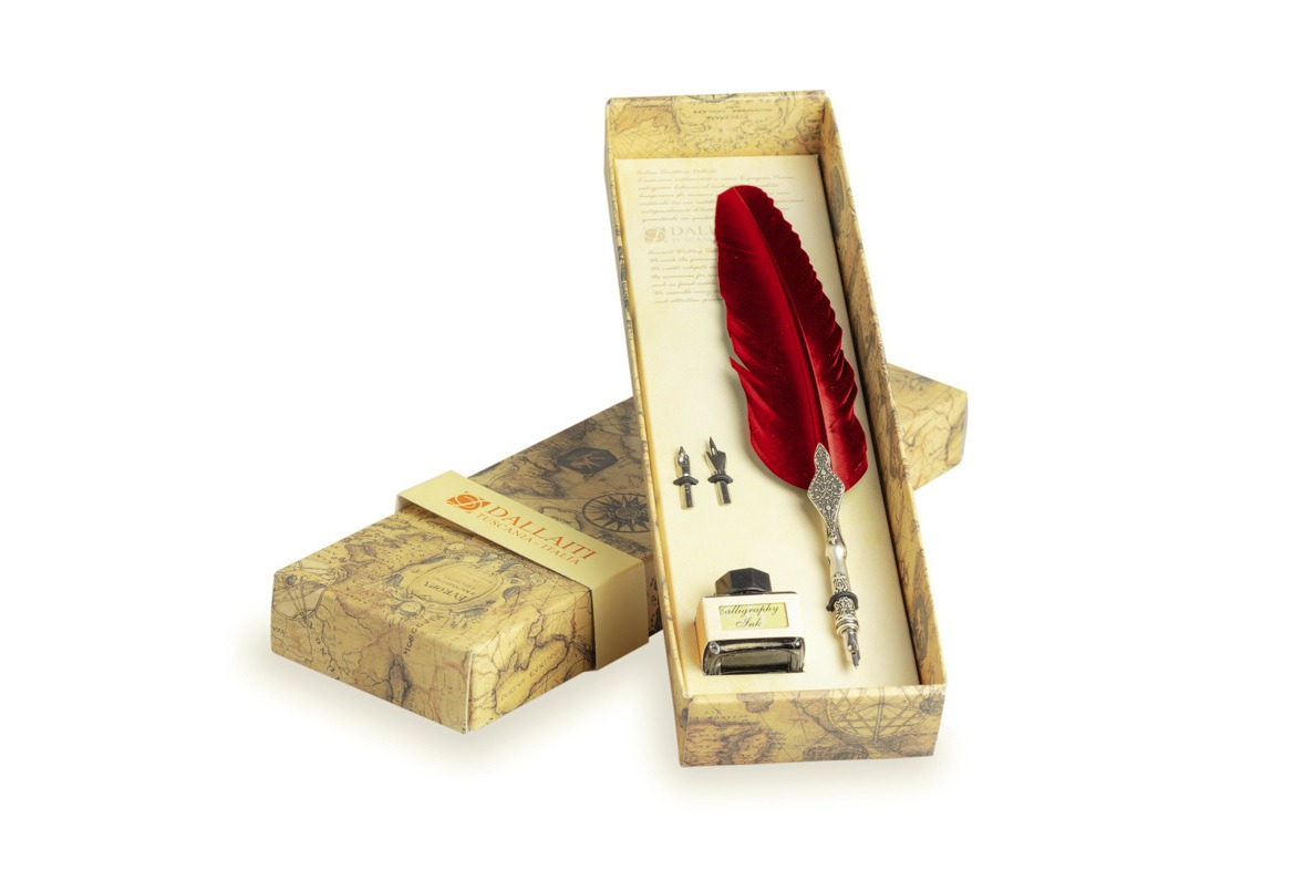 Prachtige schrijfset met daarin een decoratief bewerkte veren pen, een potje kalligrafie -inkt en bijbehorende penpunten.
