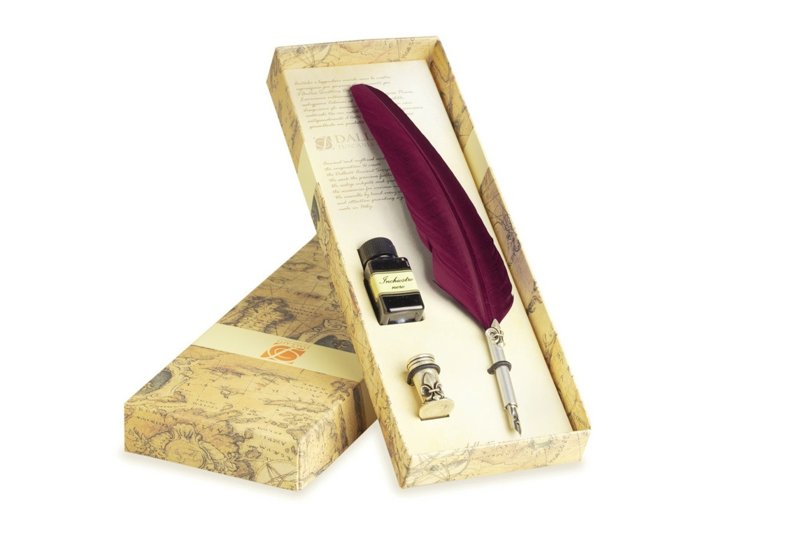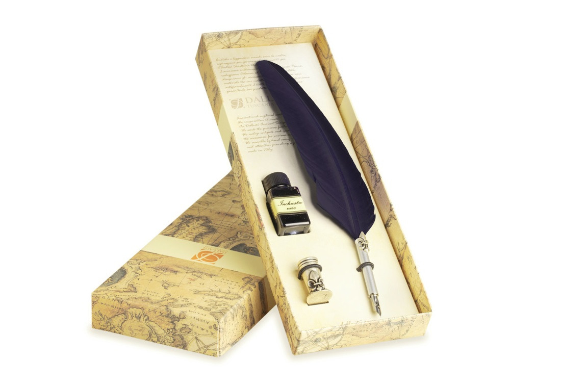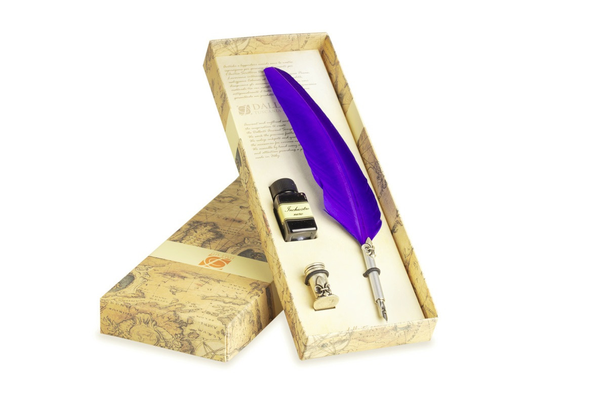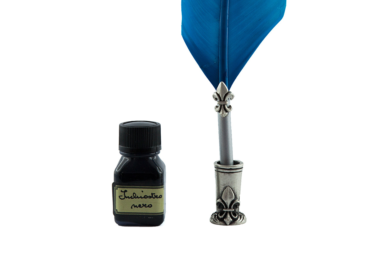 - The package beyond the feather pen is equipped with a bottle of calligraphic ink of 18 Ml black and metal pen holder decorated with the Florentine lily treated with antique silver.