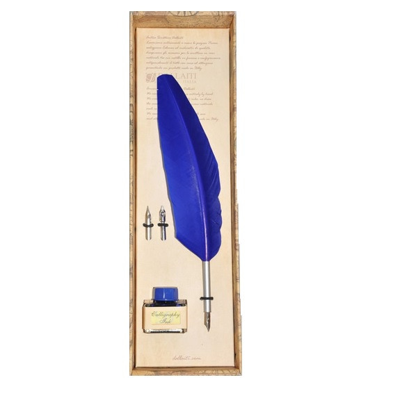 Prachtige schrijfset met daarin een decoratieve veren pen met gladde greep, een potje blauwe kalligrafie -inkt en bijbehorende penpunten.