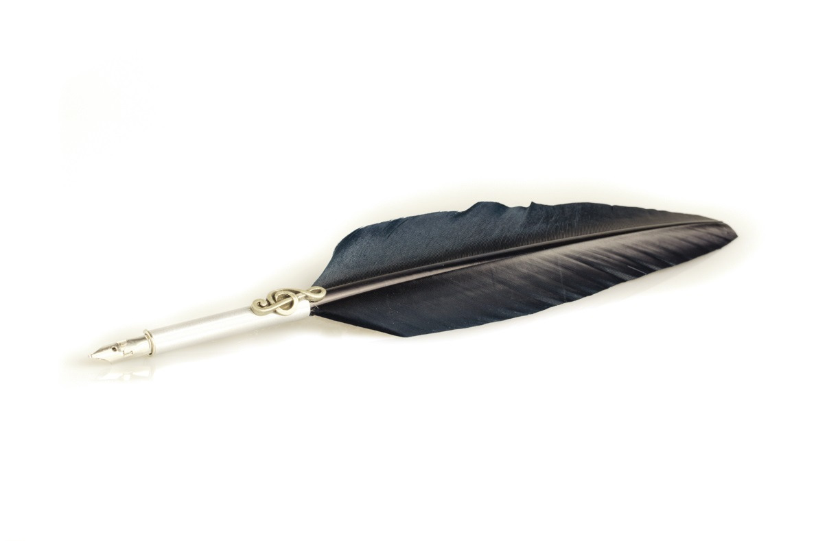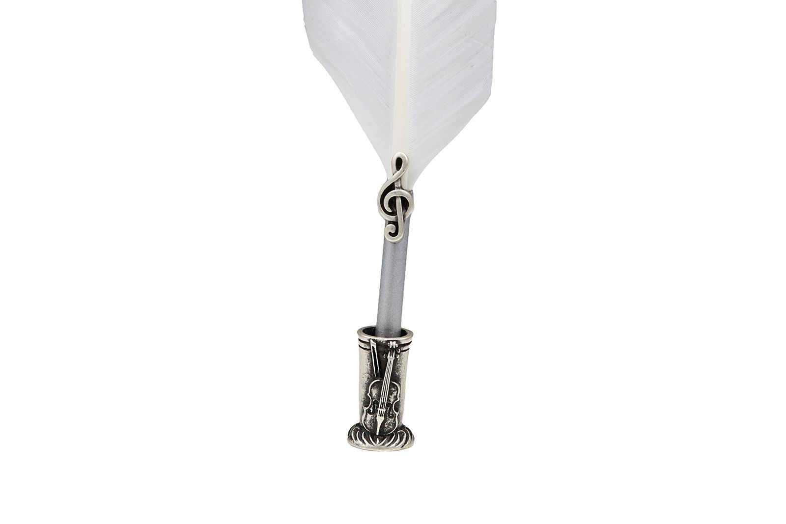 Writing set with feather pen decorated with music key, calligraphic ink and metal pen holder decorated with violin