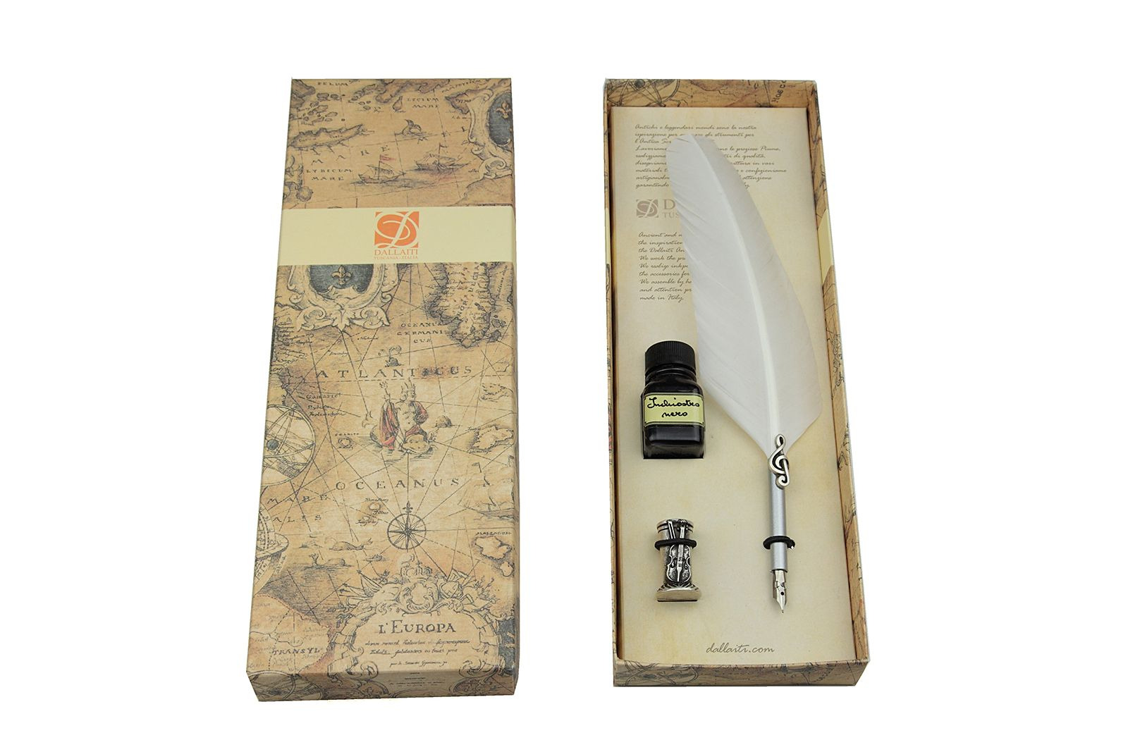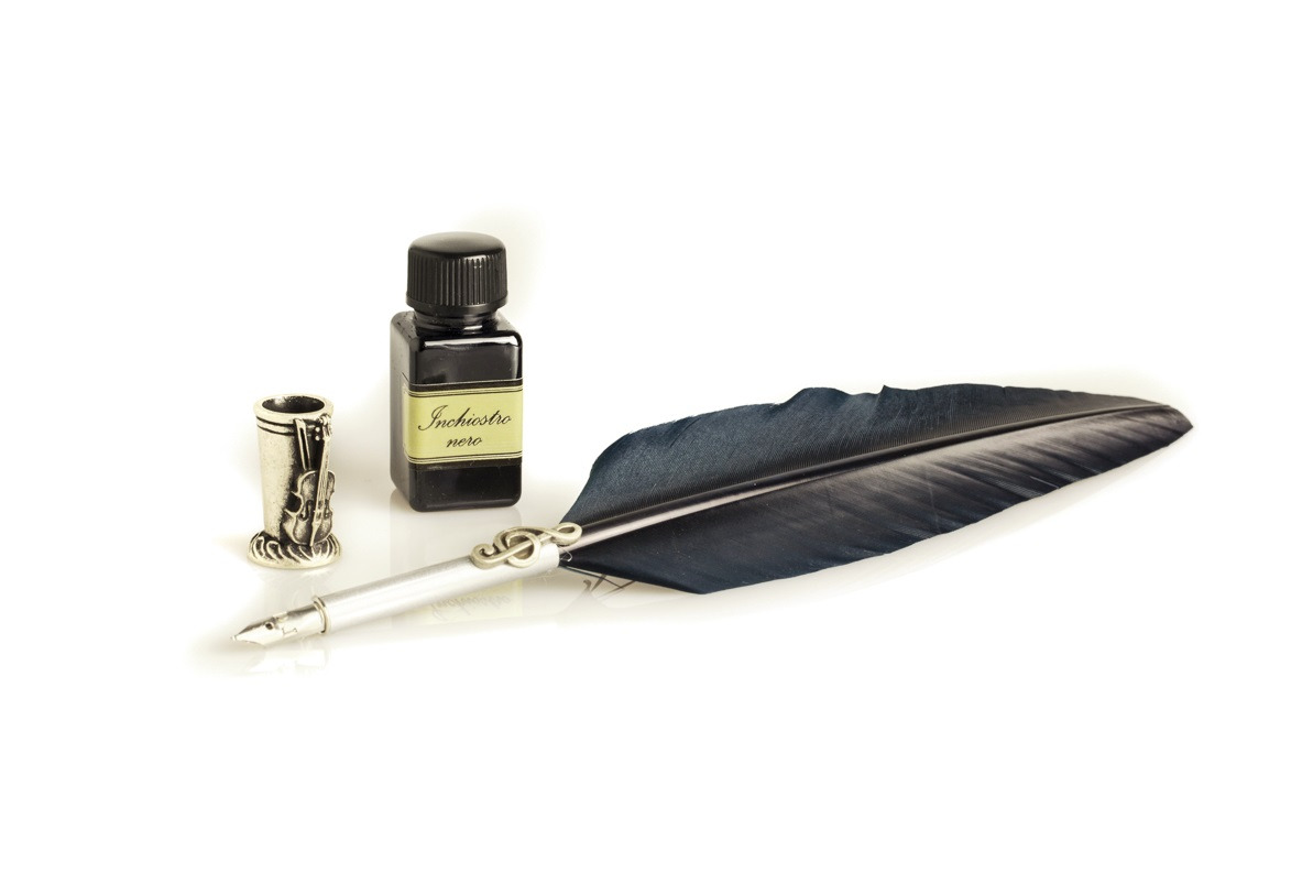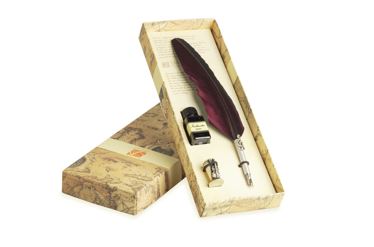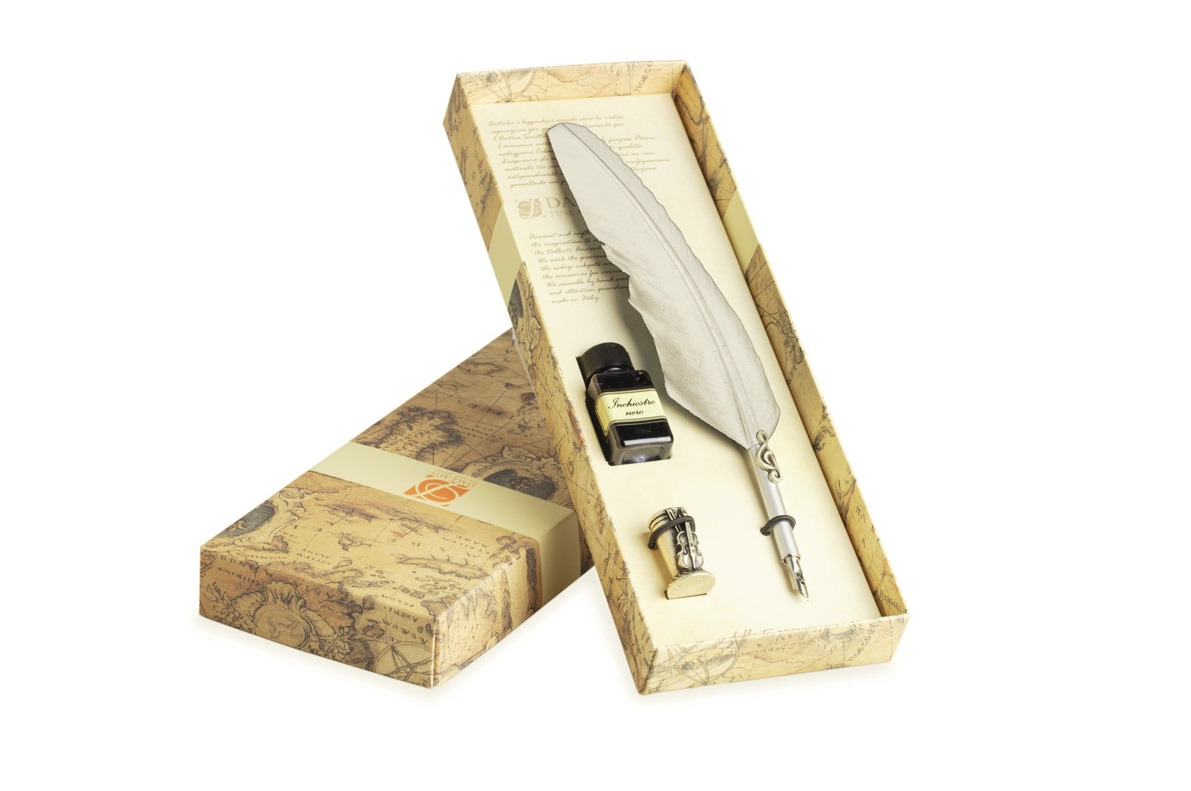 - The package beyond the feather pen is equipped with a bottle of calligraphic ink of 18 Ml black and metal pen holder decorated with the Florentine lily treated with antique silver.