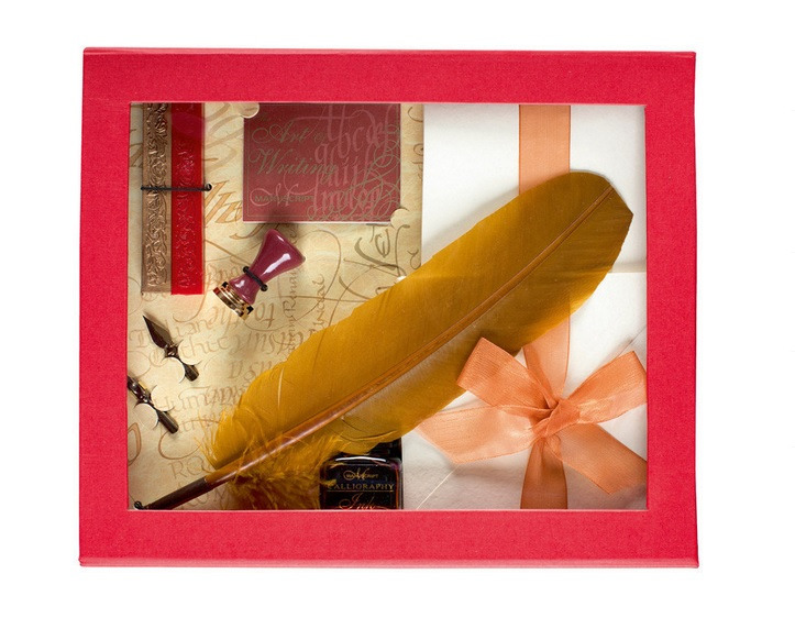 In deze set vindt u een mooie schrijfveer, twee kroontjes, een zegel met daarop een afbeelding van een inktpot met veer, twee kleuren zegelwas, inkt en 6 vellen papier met 6 enveloppen.