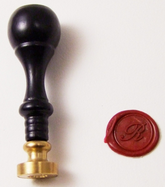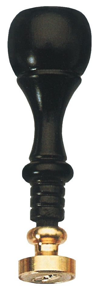 Het handvat van deze zegel is gemaakt van gelakt hout. Het is 8,5 cm groot.