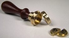 Houten houder met messing schroekop voor twee halve initiaalzegels.