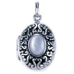 Prachtig echt zilveren medaillon , ovaal , sierlijk bewerkt met schelp inleg.