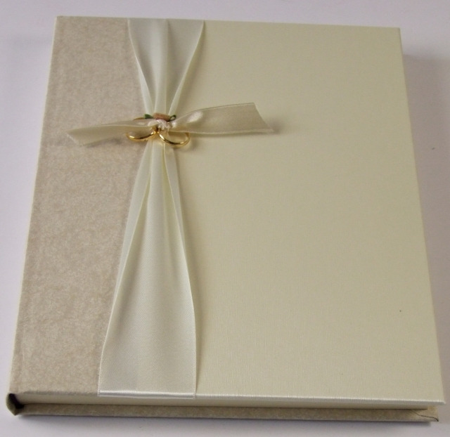 Prachtig gastenboek met op de kaft een witte strik met daaraan twee gouden ringen.