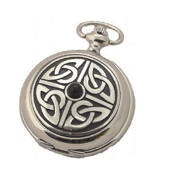 Zeer mooi zakhorloge met daarop een afbeelding van een keltische knoop met daarin een zwarte steen.