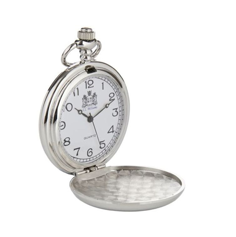 Dit zakhorloge heeft een zilverkleurige deksel, met daarop de gravure.